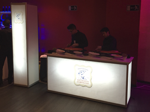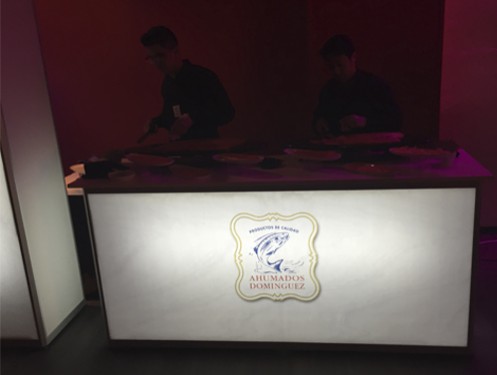 Por su parte, la empresa Ahumados Domínguez también nos ha realizado el alquiler de un tótem fluorescente y, además, ha solicitado el alquiler de una barra de bar retroiluminada para la degustación de sus productos.
